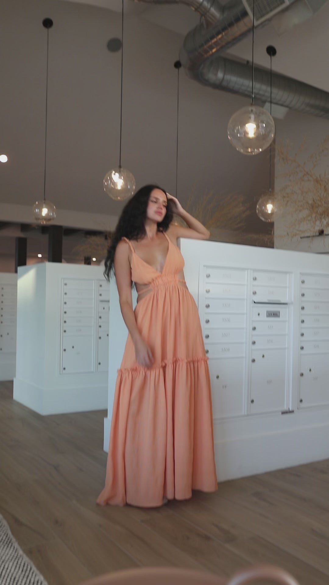This eye-catching orange backless maxi dress has a spaghetti strap, cutout detail, and textured fabric for a flattering chic look. Its lightweight long silhouette makes it an ideal choice for vacations or a summer night out.