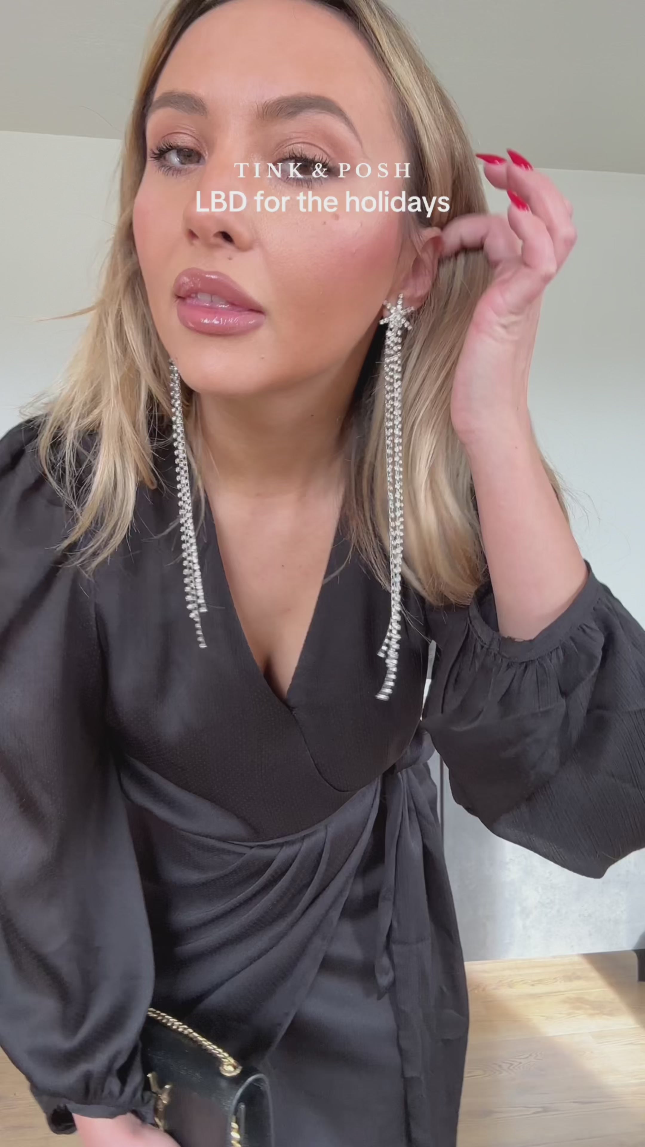 Sexy and feminine! The Adele Wrap Mini Dress features a mini dress length with long puff sleeves and a wrap style design. The fabric has a pin dot design throughout the black stain fabric. Pair the dress with sexy scrappy heels for a dinner date night or a New Years eve cocktail dress outfit.