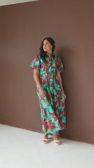 Turn heads in this vibrant puff sleeve shirt dress, designed with a bold green and brown printed and a flattering button down collar dress shirt style. This printed shirt maxi dress combines elegance and ease, featuring a structured collar, button down front, and a tiered flowing skirt that moves with you.