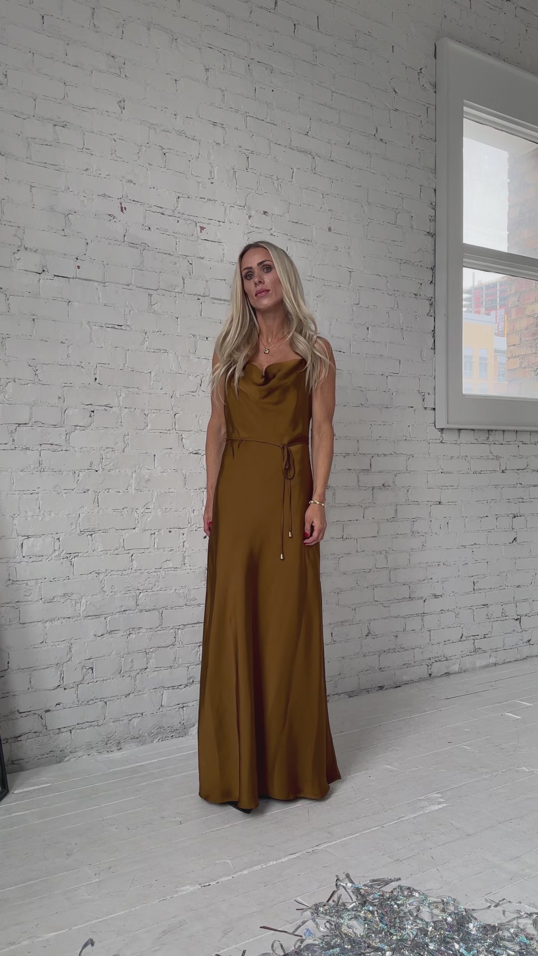 This elegant maxi dress features a silky bronze brown satin material with a slip maxi style, criss cross back, and cowl neckline for a sophisticated finish. Crafted with a form-fitting silhouette to flatter your figure, this dress is perfect for a formal occasion.