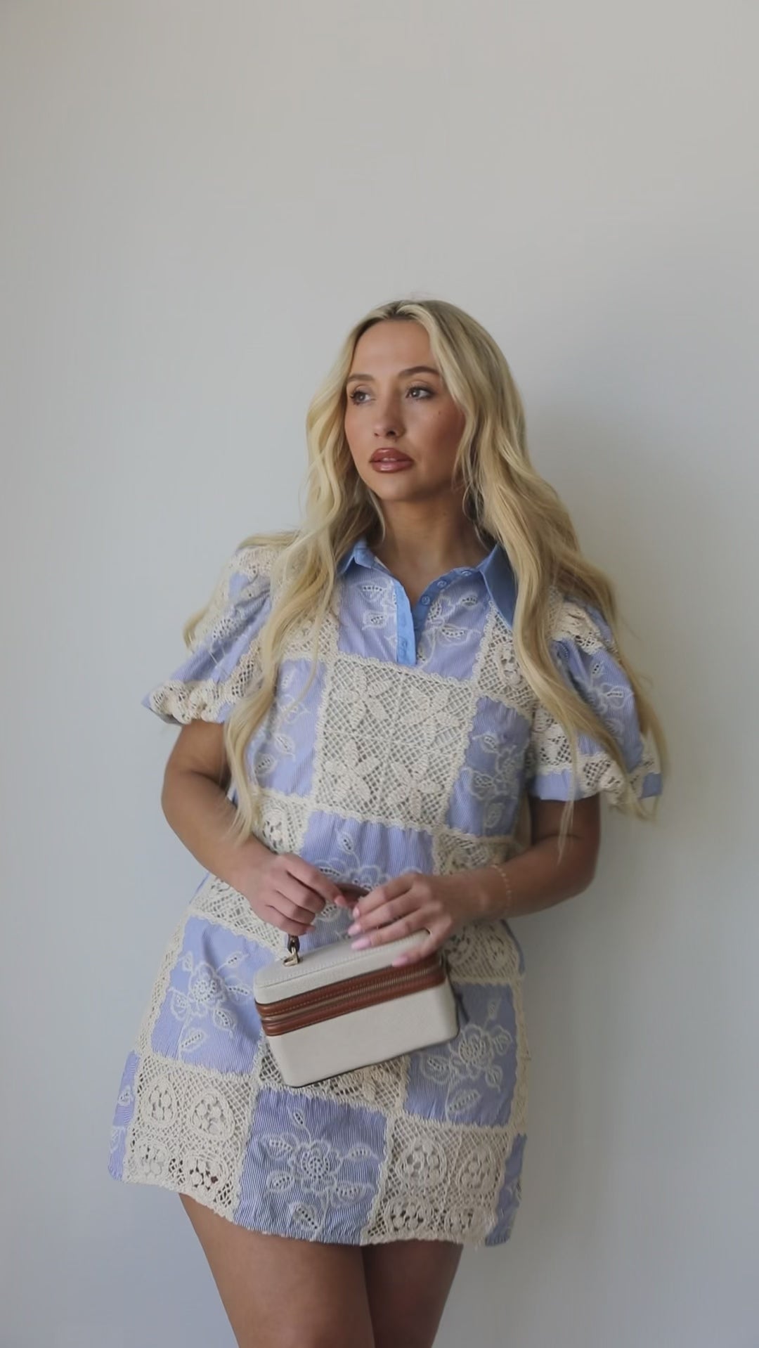 Expertly crafted for a beautiful fit, the CROCHET MINI SHIRT DRESS offers a unique blend of comfort and style. The blue and cream colors add a touch of elegance, while the crochet detailing adds a subtle yet eye-catching statement. Perfect for any occasion, this dress is a must-have for your wardrobe.