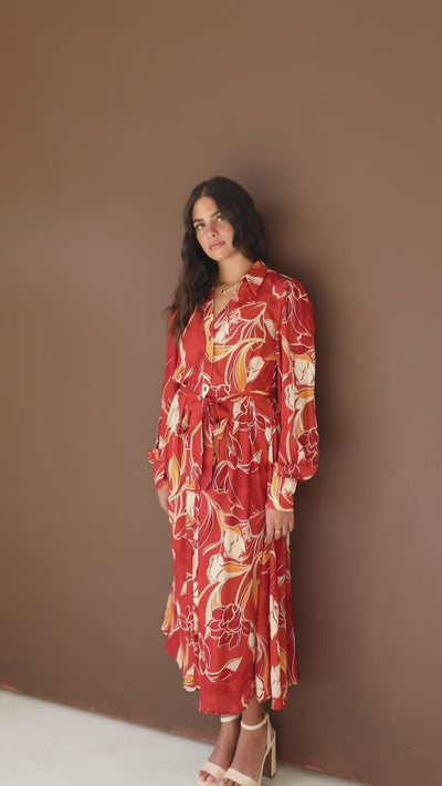 Elevate your fall wardrobe with this rust floral long sleeve midi dress. The printed midi dress blends classic details with seasonal tones. Designed with a structured collar, self-tie sash, and a flowing full skirt, it's a refined choice for transitional weather, weekend plant or casual events.