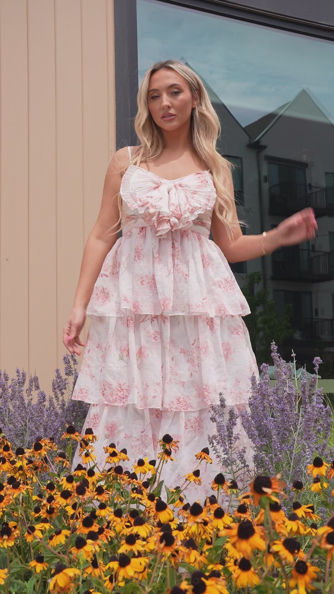 Expertly crafted with a stunning floral print and delicate spaghetti straps, our pink tiered midi dress is the epitome of elegance. The front bow adds a touch of femininity, making it perfect for any special occasion. Its effortless style and flattering fit make it a must-have addition to any wardrobe.