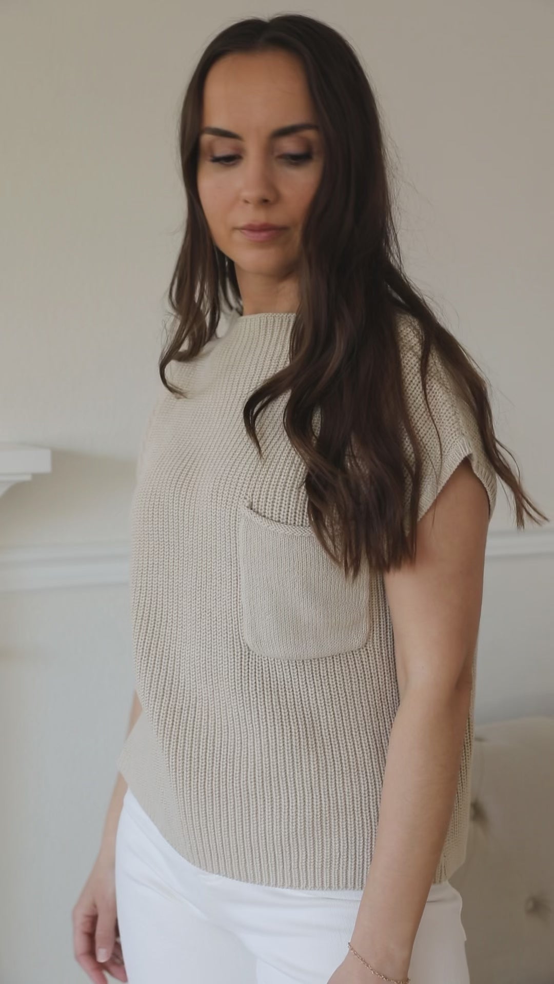 This taupe knit sweater top with pocket offers a relaxed fit and is made from high-quality cotton. Stay comfortable and stylish with the added convenience of a pocket. Perfect for any occasion, this top is a must-have in your wardrobe.