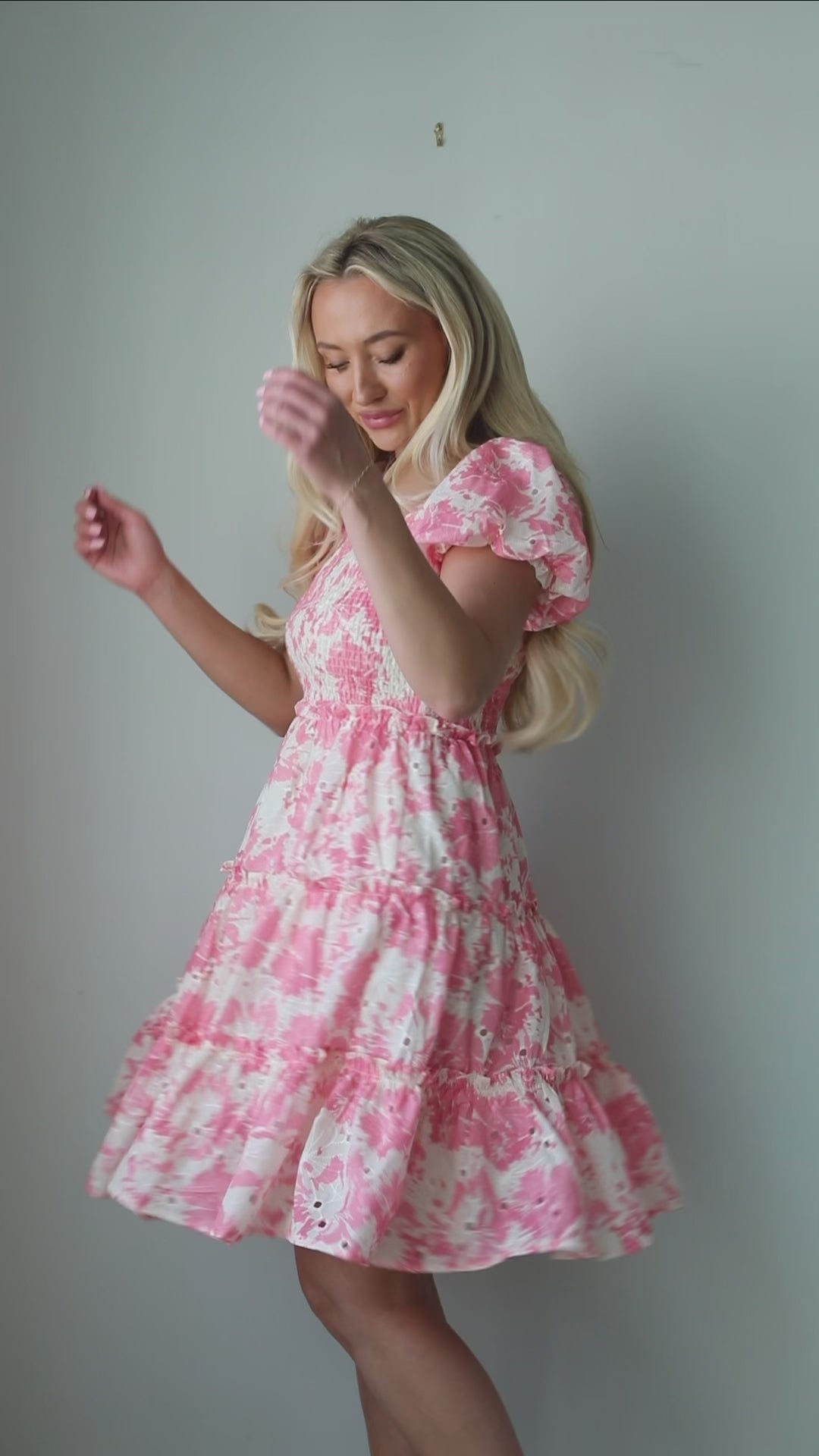 Upgrade your wardrobe with our Pink Puff Sleeve Floral Dress. The dress features a smocked top with delicate puff sleeves, made from high-quality eyelet fabric. With a square neckline and convenient pockets, this dress is perfect for any occasion. Elevate your style with this charming and elegant dress.