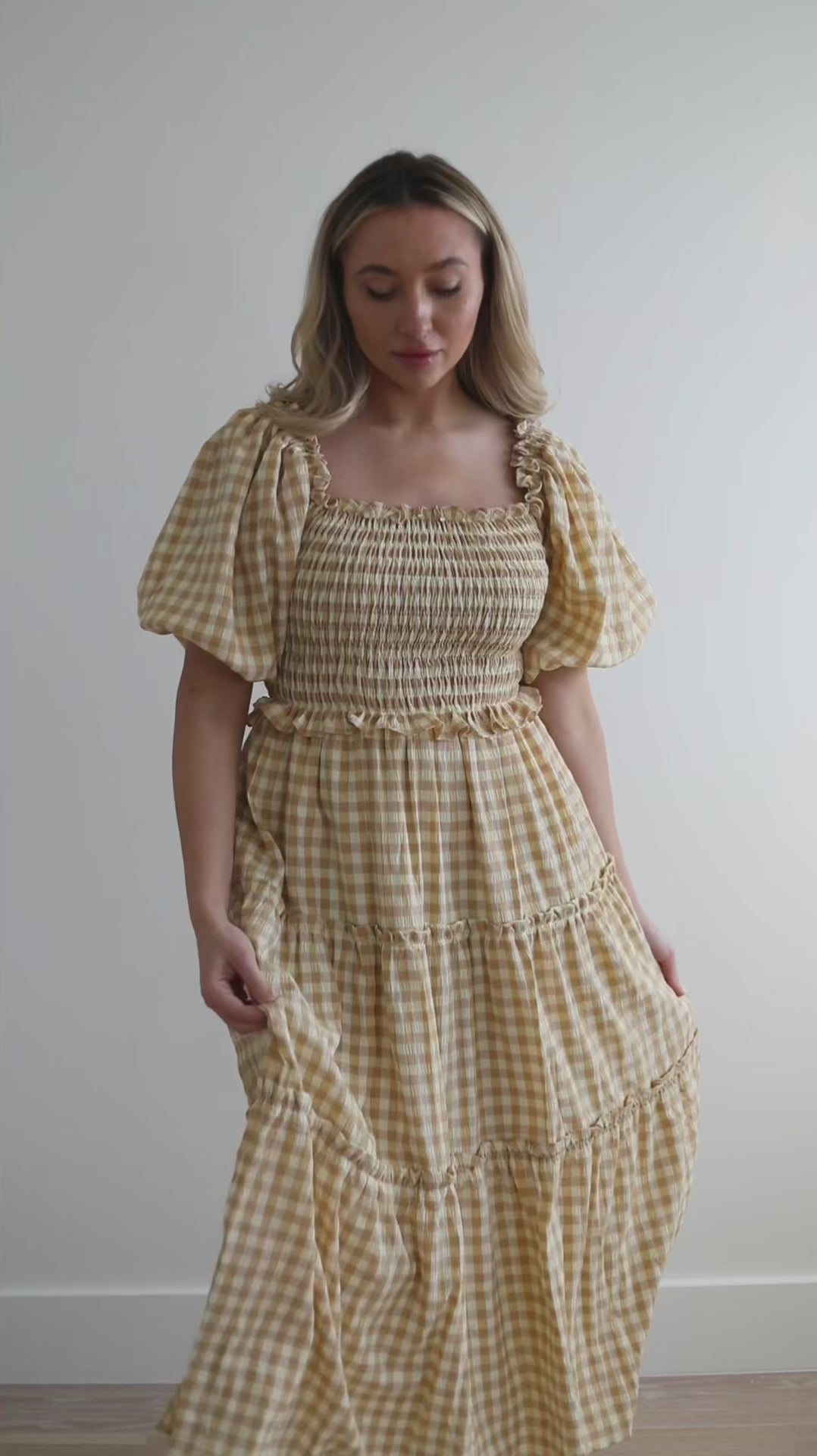 Introducing the Dahlia Gingham Maxi Dress. With its yellow gingham pattern, midi length, and puff sleeves, this dress is perfect for any occasion. The smocked bodice and tiered style add a touch of elegance to this must-have piece. Comfort and style come together in this stunning dress.